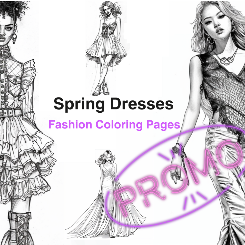 - 5 Unique Dress Coloring Pages: Explore the most coveted spring dress trends for 2024. Each page invites you to unleash your creativity on a fresh canvas.
